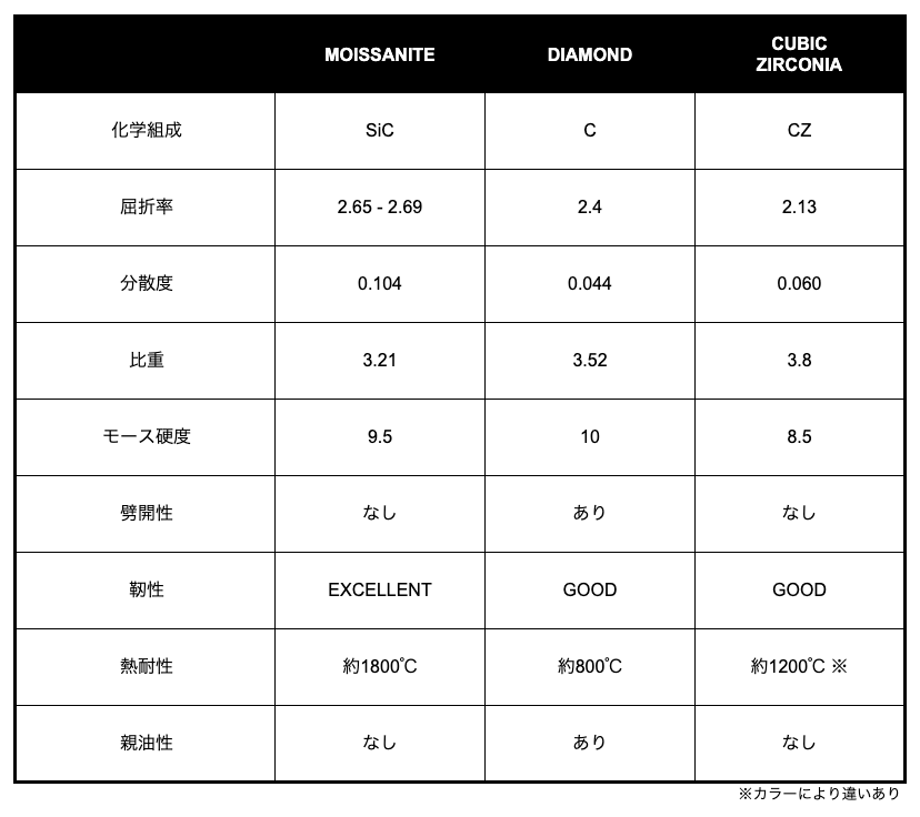 モアサナイト、ダイヤモンド、キュービックジルコニアの比較表