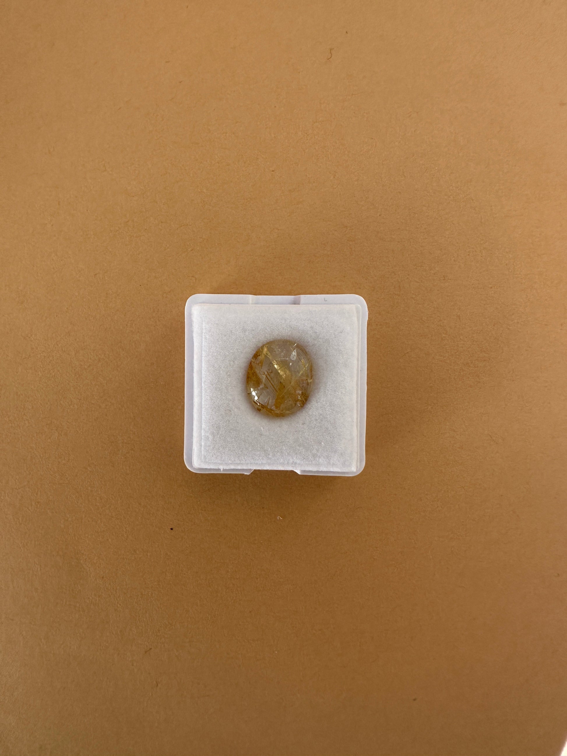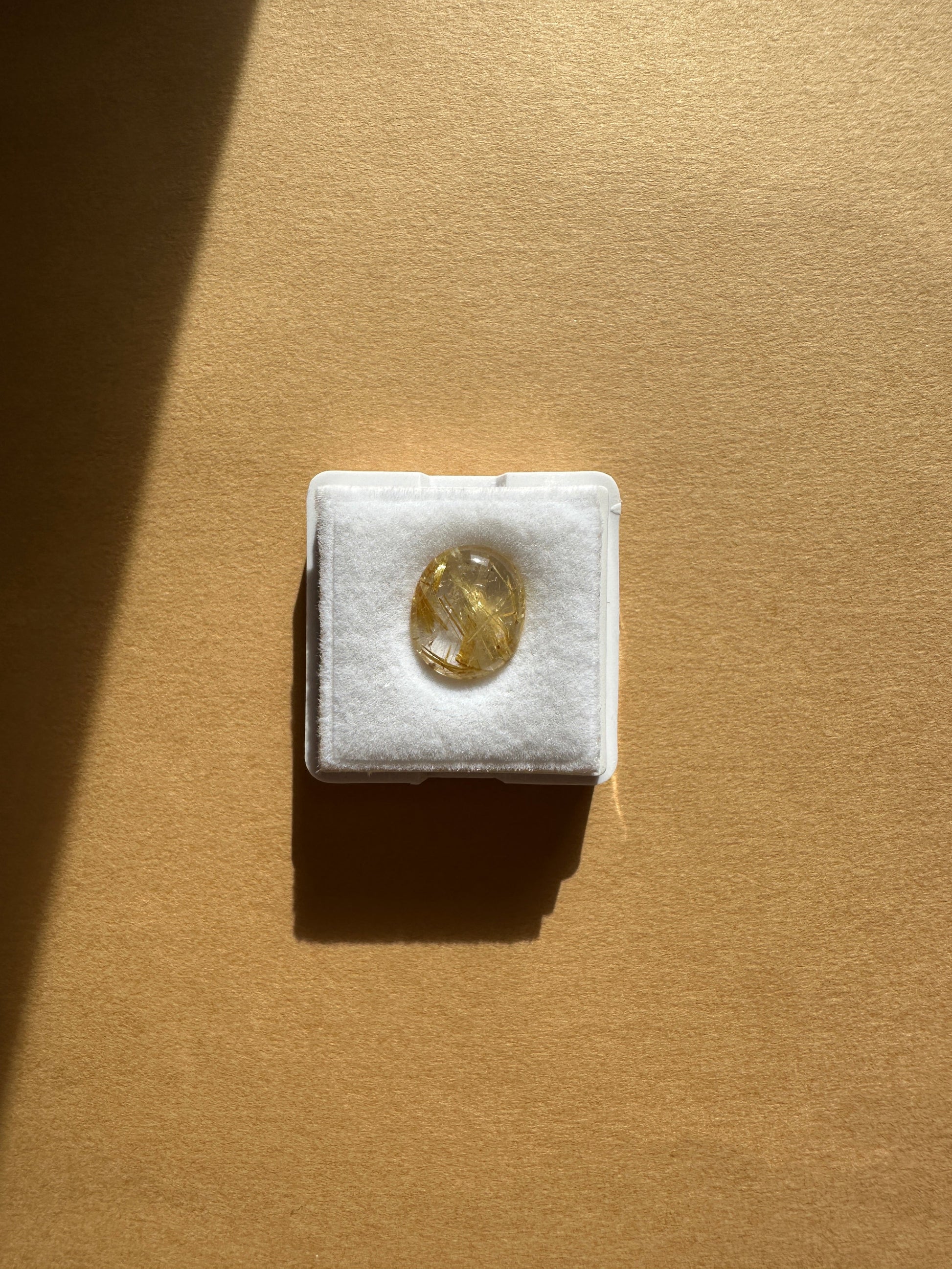 ゴールドの色合い、針の入り方、水晶の透明度がいずれも美しく、両面をカボションカットで磨いた、まろやかなフォルムが印象的です。