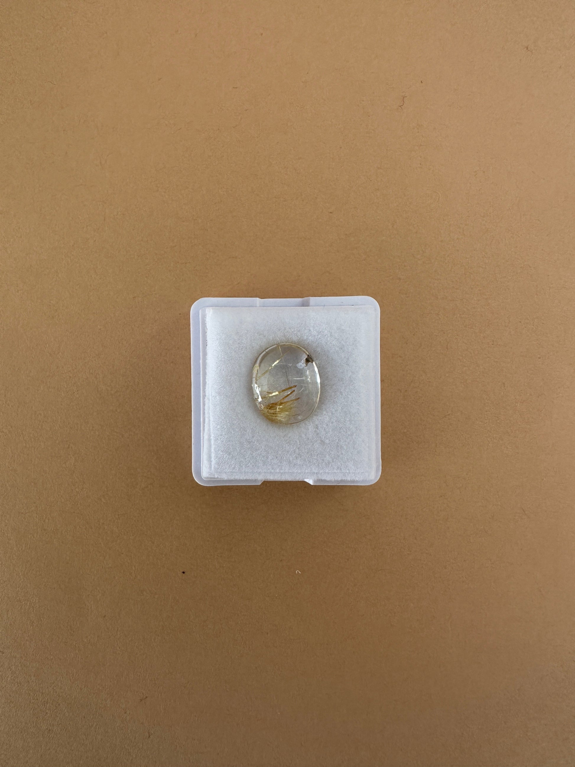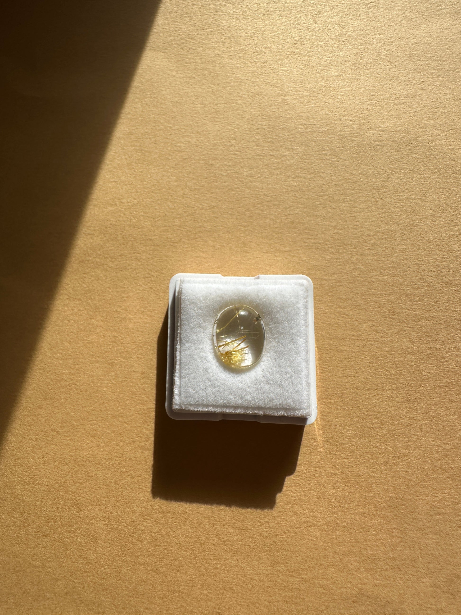 ゴールドの色合い、針の入り方、水晶の透明度がいずれも美しく、両面をカボションカットで磨いた、まろやかなフォルムが印象的です。