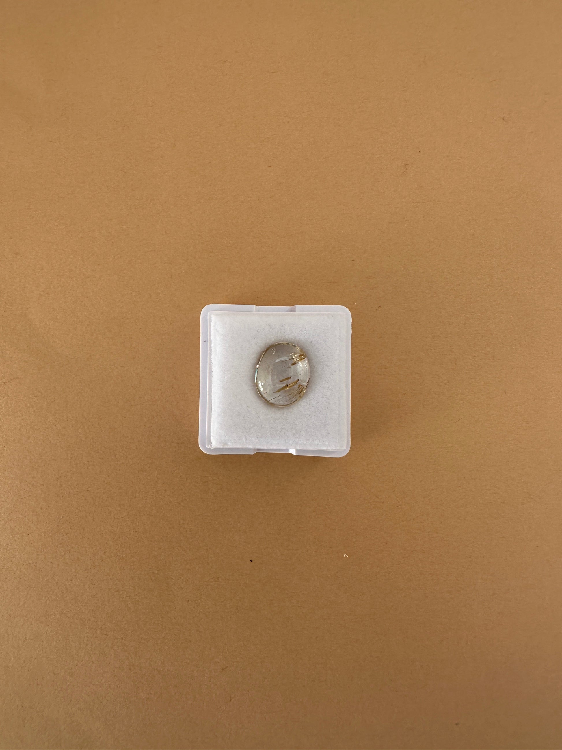 ゴールドの色合い、針の入り方、水晶の透明度がいずれも美しく、両面をカボションカットで磨いた、まろやかなフォルムが印象的です。