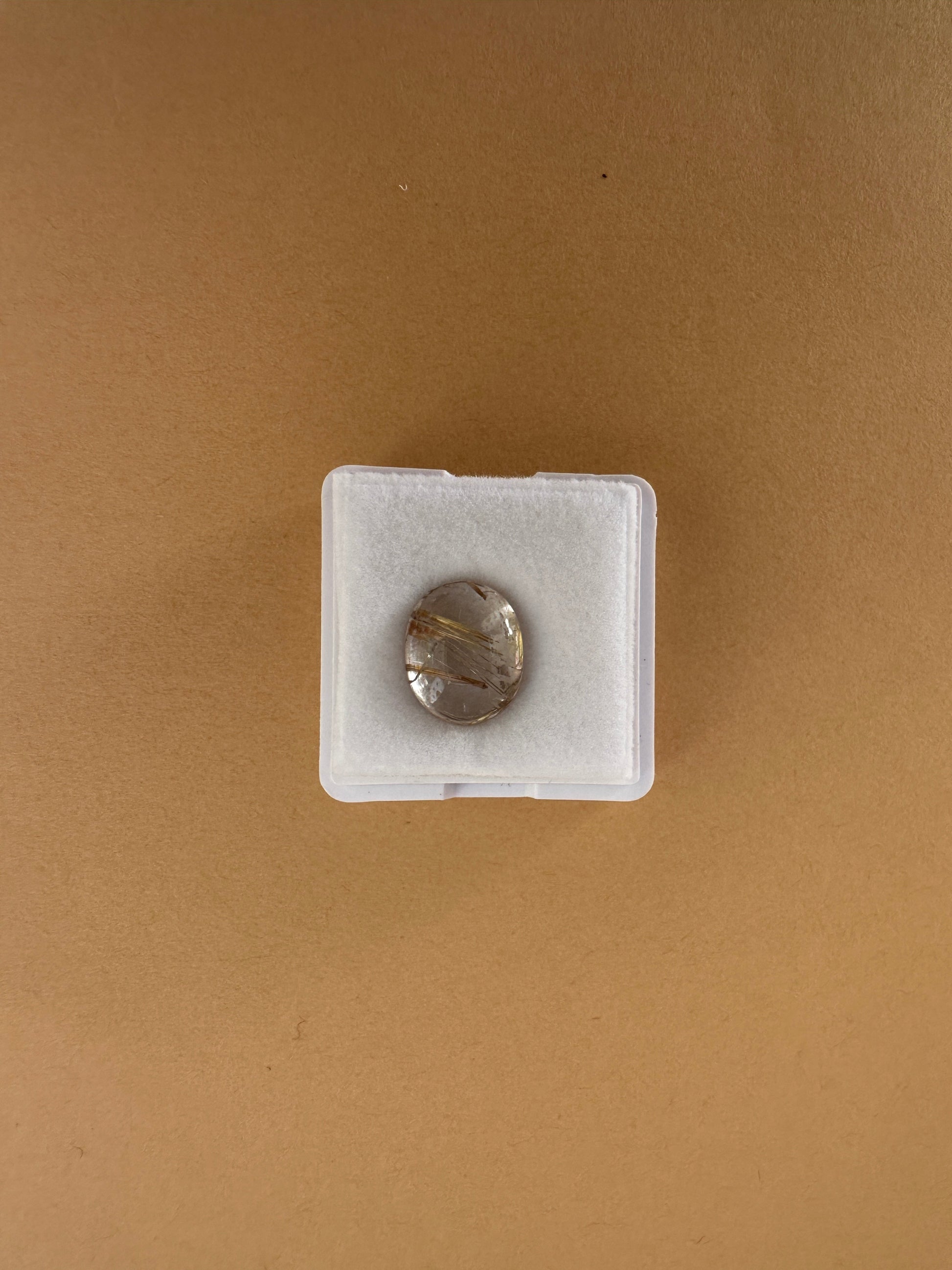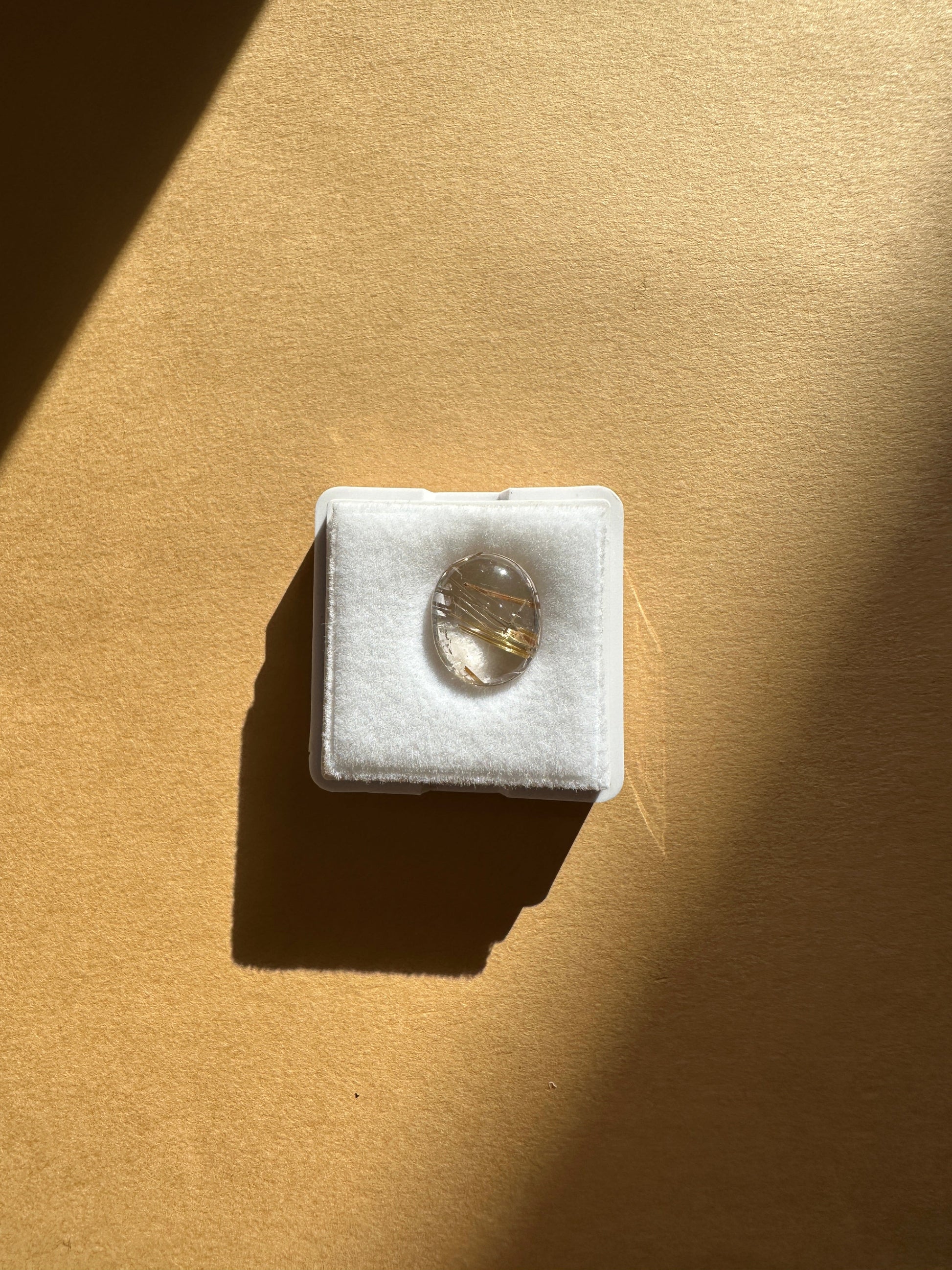 ゴールドの色合い、針の入り方、水晶の透明度がいずれも美しく、両面をカボションカットで磨いた、まろやかなフォルムが印象的です。