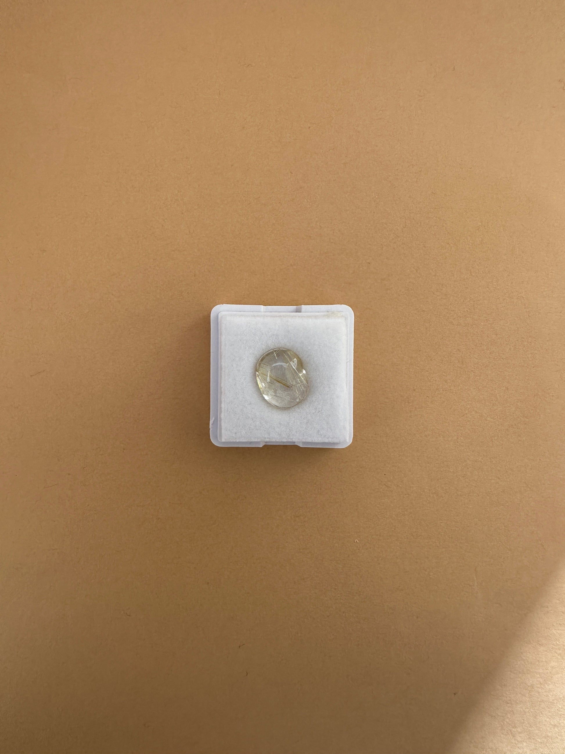 ゴールドの色合い、針の入り方、水晶の透明度がいずれも美しく、両面をカボションカットで磨いた、まろやかなフォルムが印象的です。