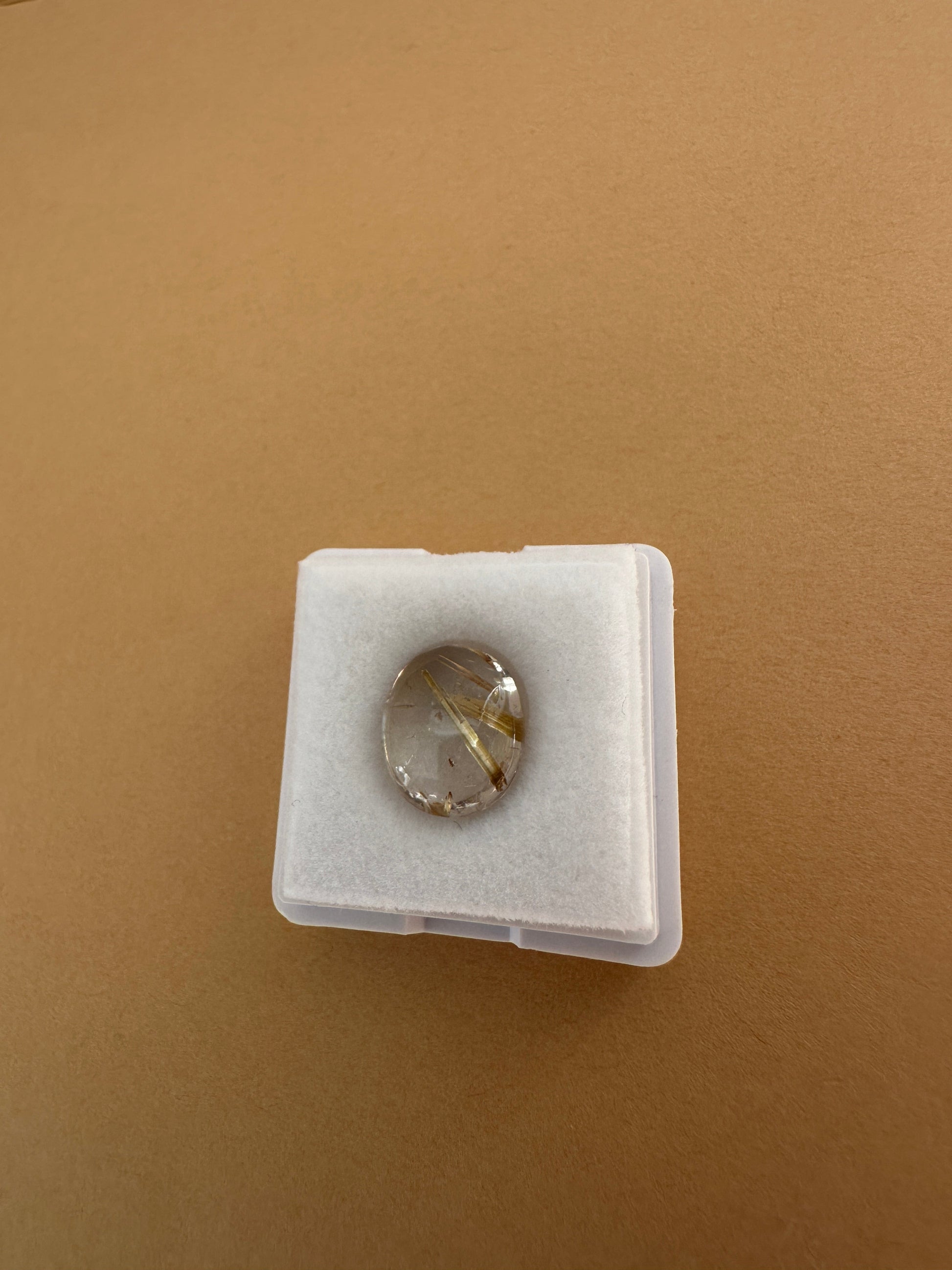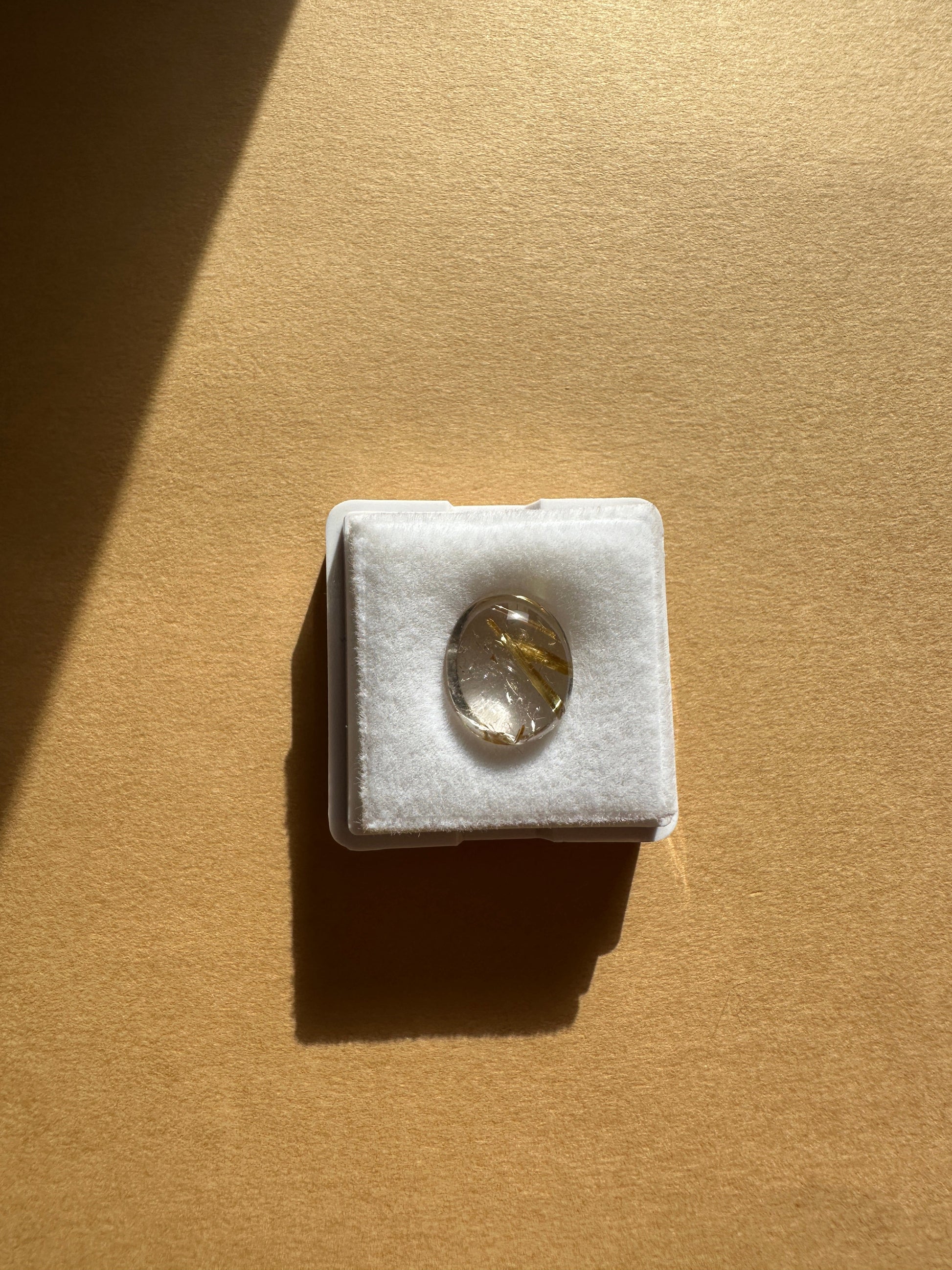 ゴールドの色合い、針の入り方、水晶の透明度がいずれも美しく、両面をカボションカットで磨いた、まろやかなフォルムが印象的です。