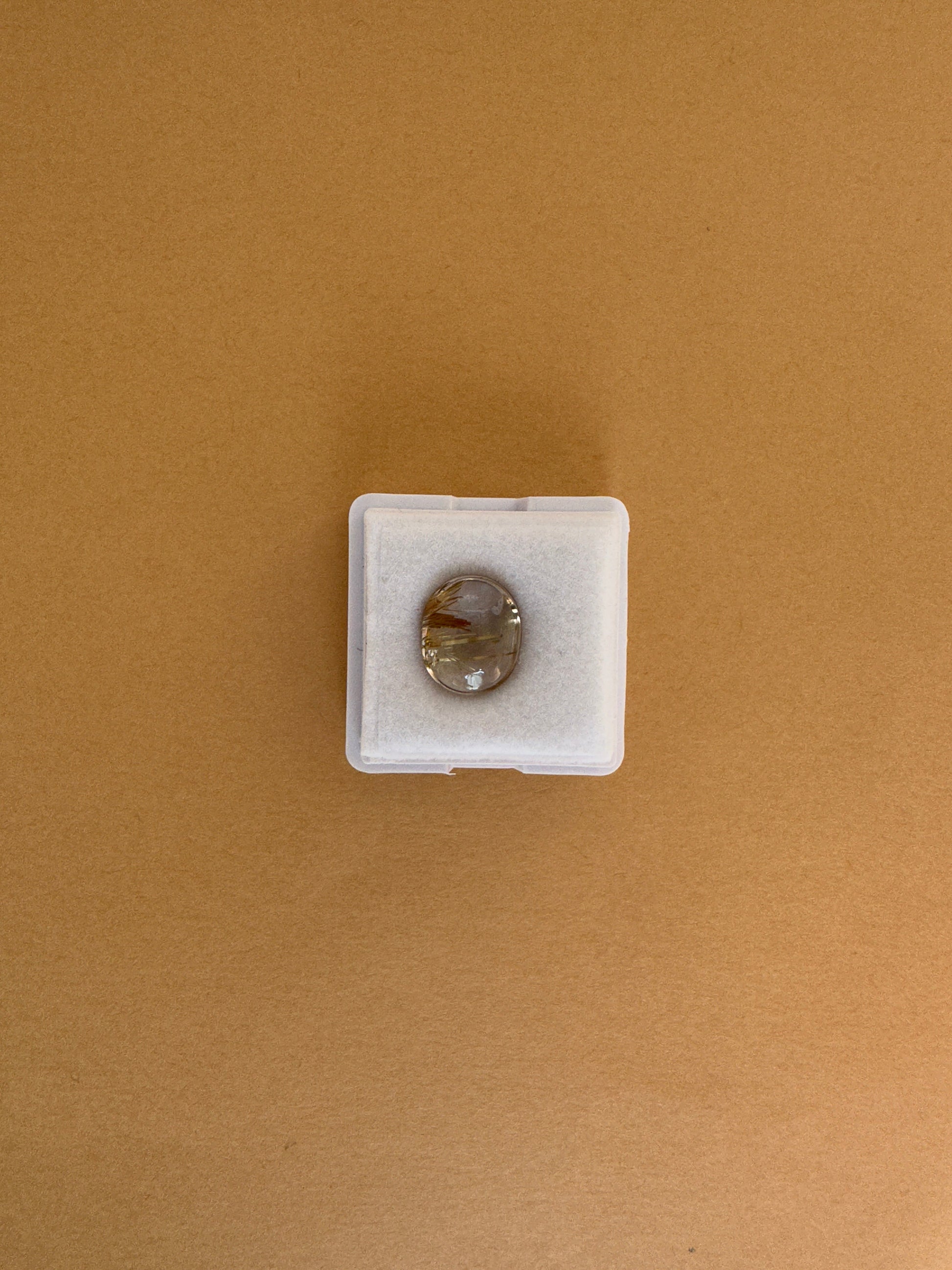 ゴールドの色合い、針の入り方、水晶の透明度がいずれも美しく、両面をカボションカットで磨いた、まろやかなフォルムが印象的です。