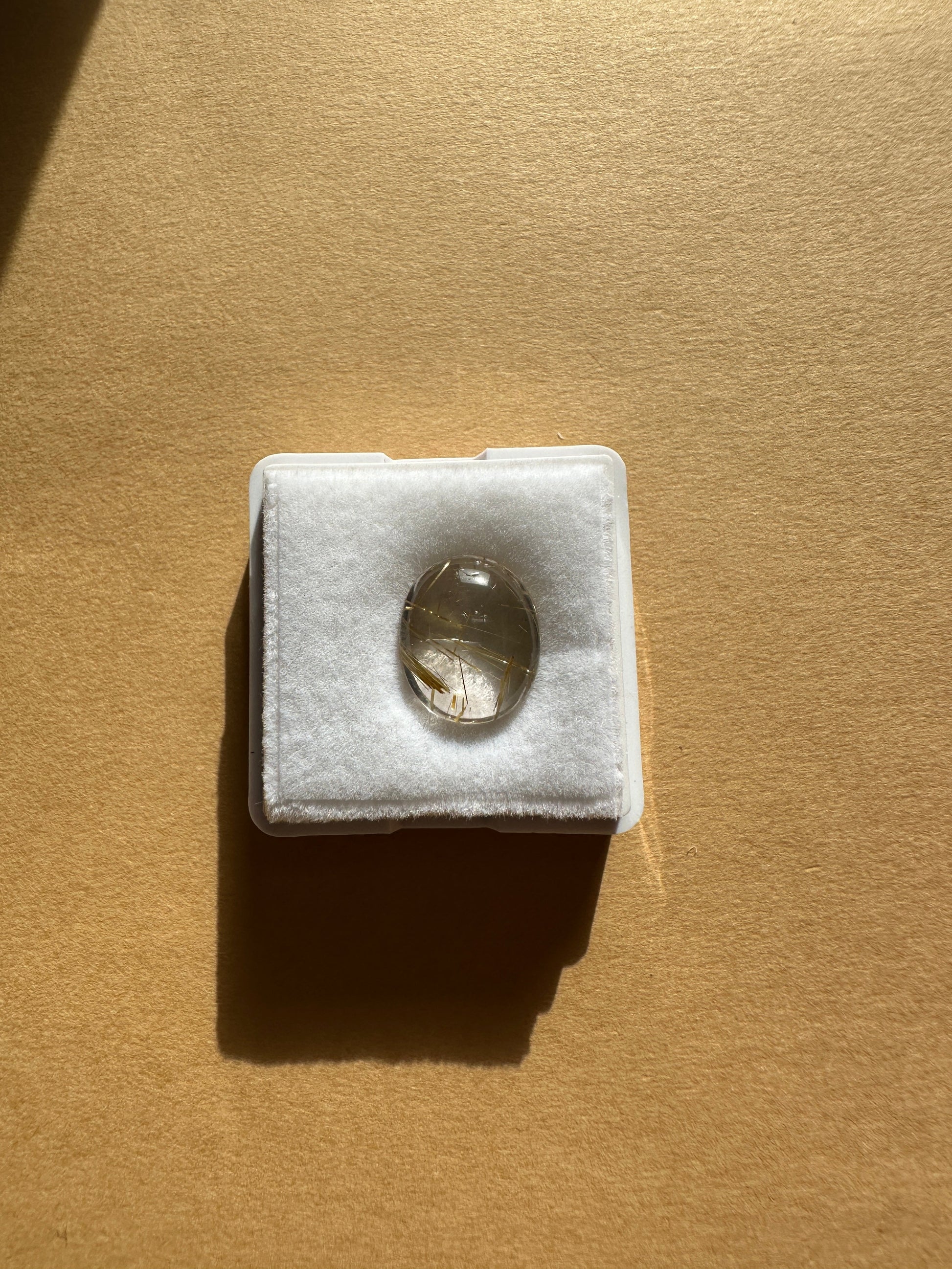 ゴールドの色合い、針の入り方、水晶の透明度がいずれも美しく、両面をカボションカットで磨いた、まろやかなフォルムが印象的です。