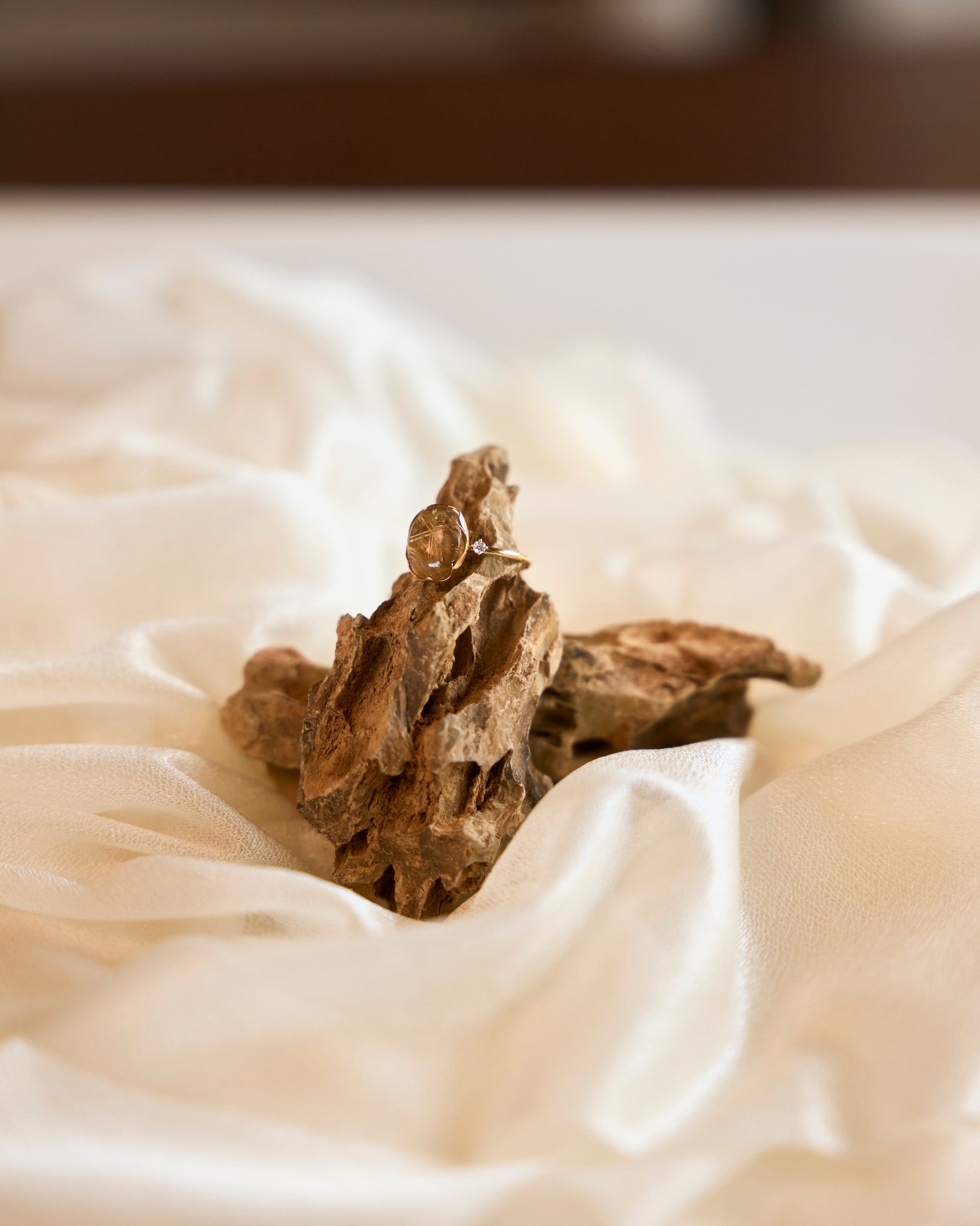 本作では、ルチルの透明感と繊細な針模様を最大限に生かすよう、シンプルで上質なデザインに仕立てました。